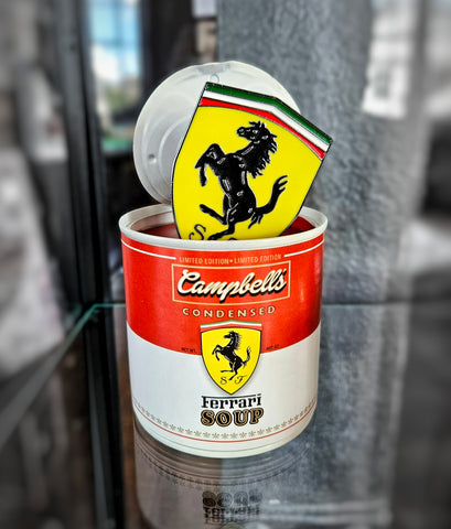 Ein Hoch auf die Ikonen der Konsumkultur: „Car Soup“ verbindet das legendäre Campbell’s Suppendosen-Design mit den Emblemen der automobilen Oberklasse – Porsche, Ferrari und mehr. Jede Dose ist ein handgefertigtes Kunstobjekt, das Pop-Art und Luxusbranding auf augenzwinkernde Weise vereint.