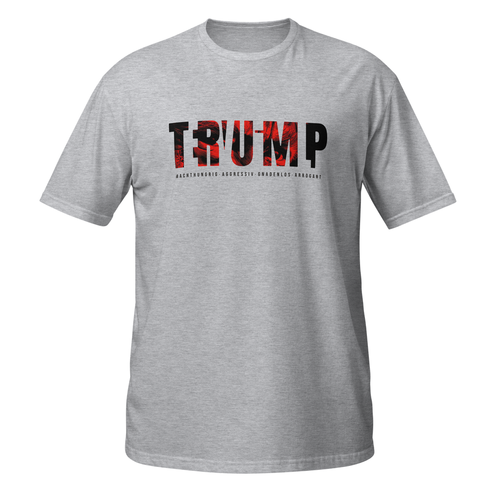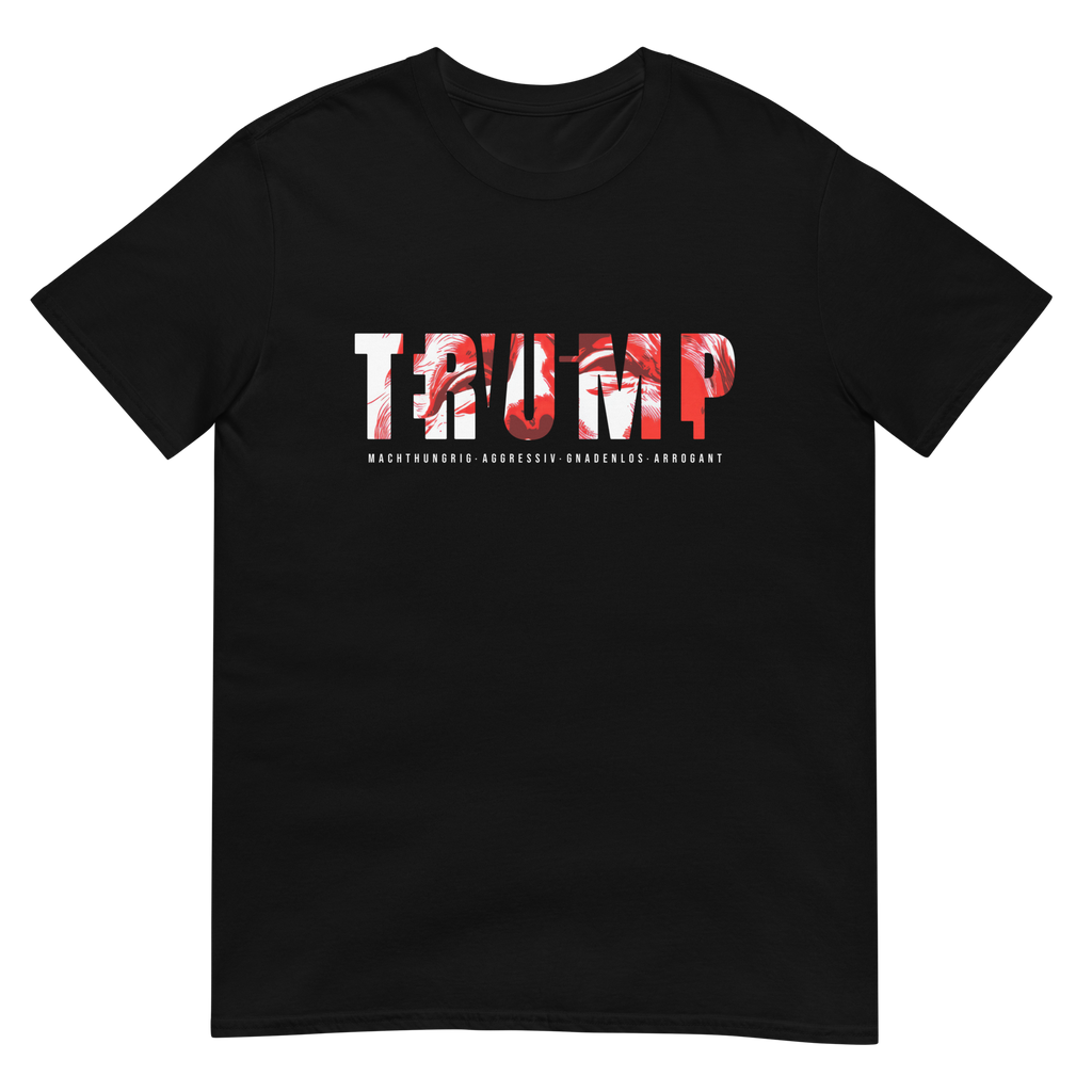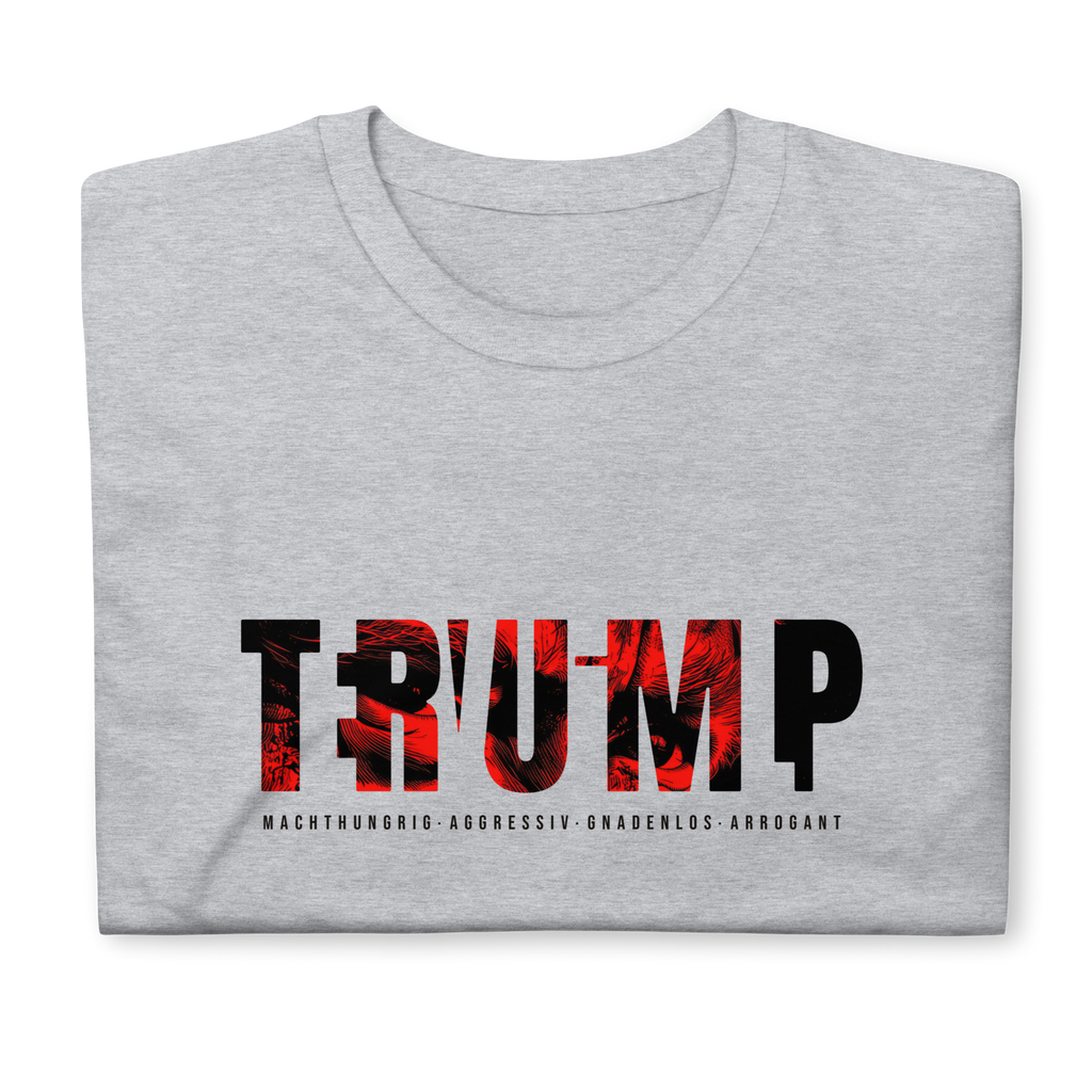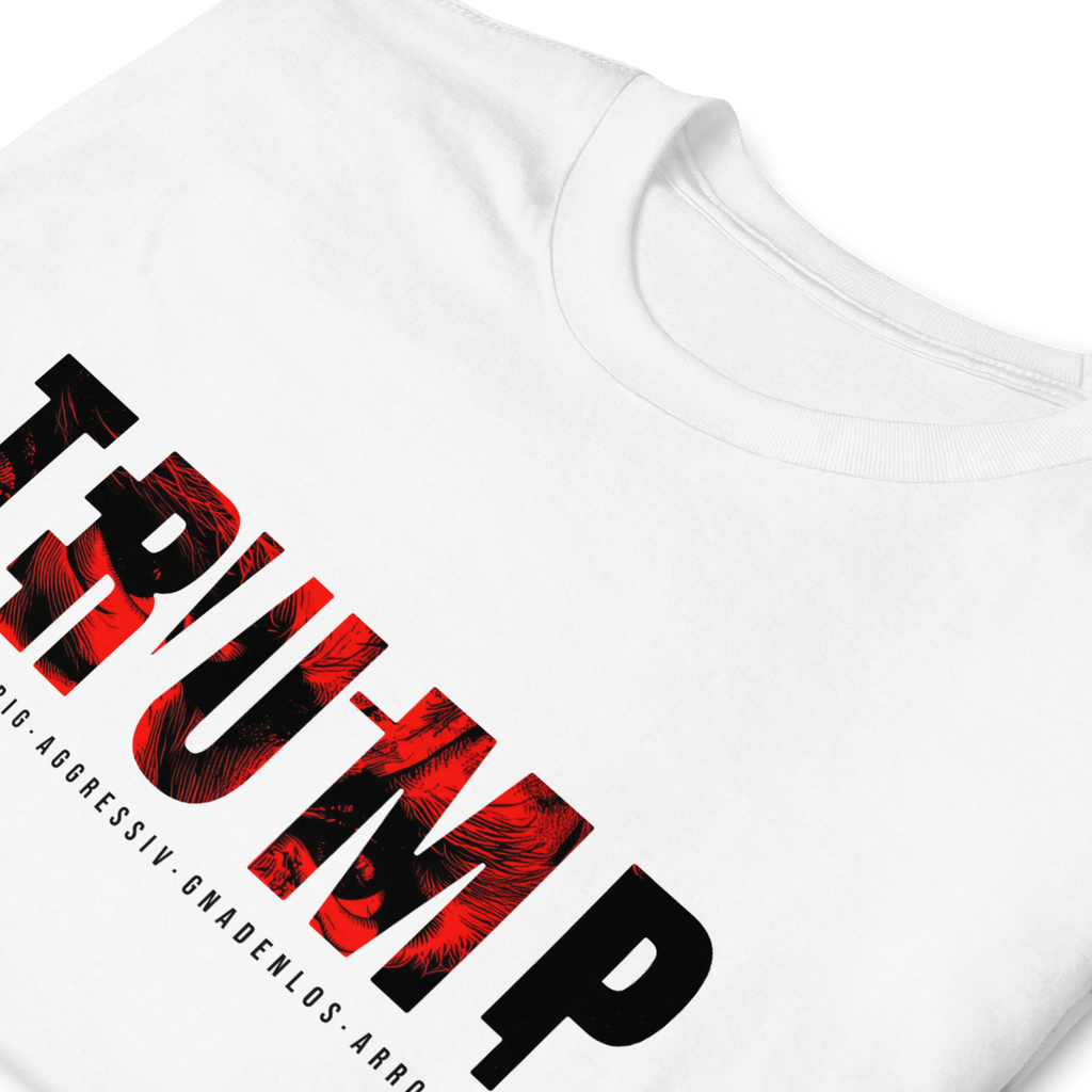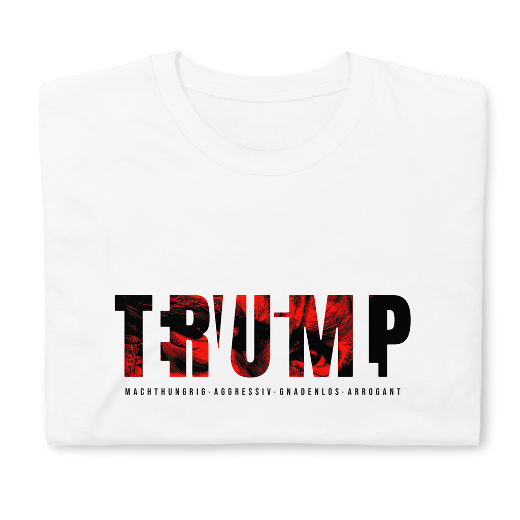 Auf den ersten Blick steht groß Trump auf der Brust. Wer genauer hinsieht, erkennt das versteckte Wort Evil. Ein typografischer Seitenhieb mit doppelter Bedeutung.