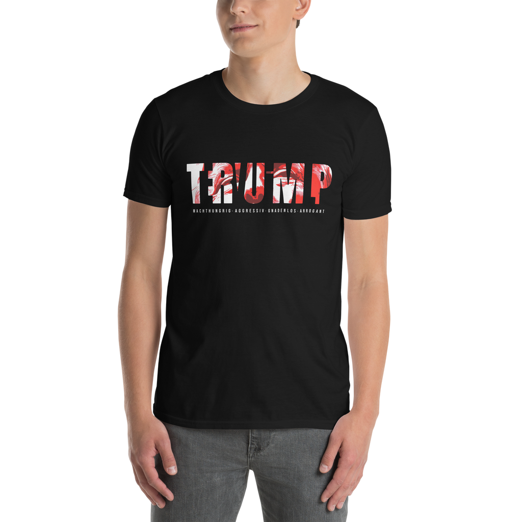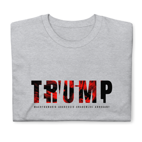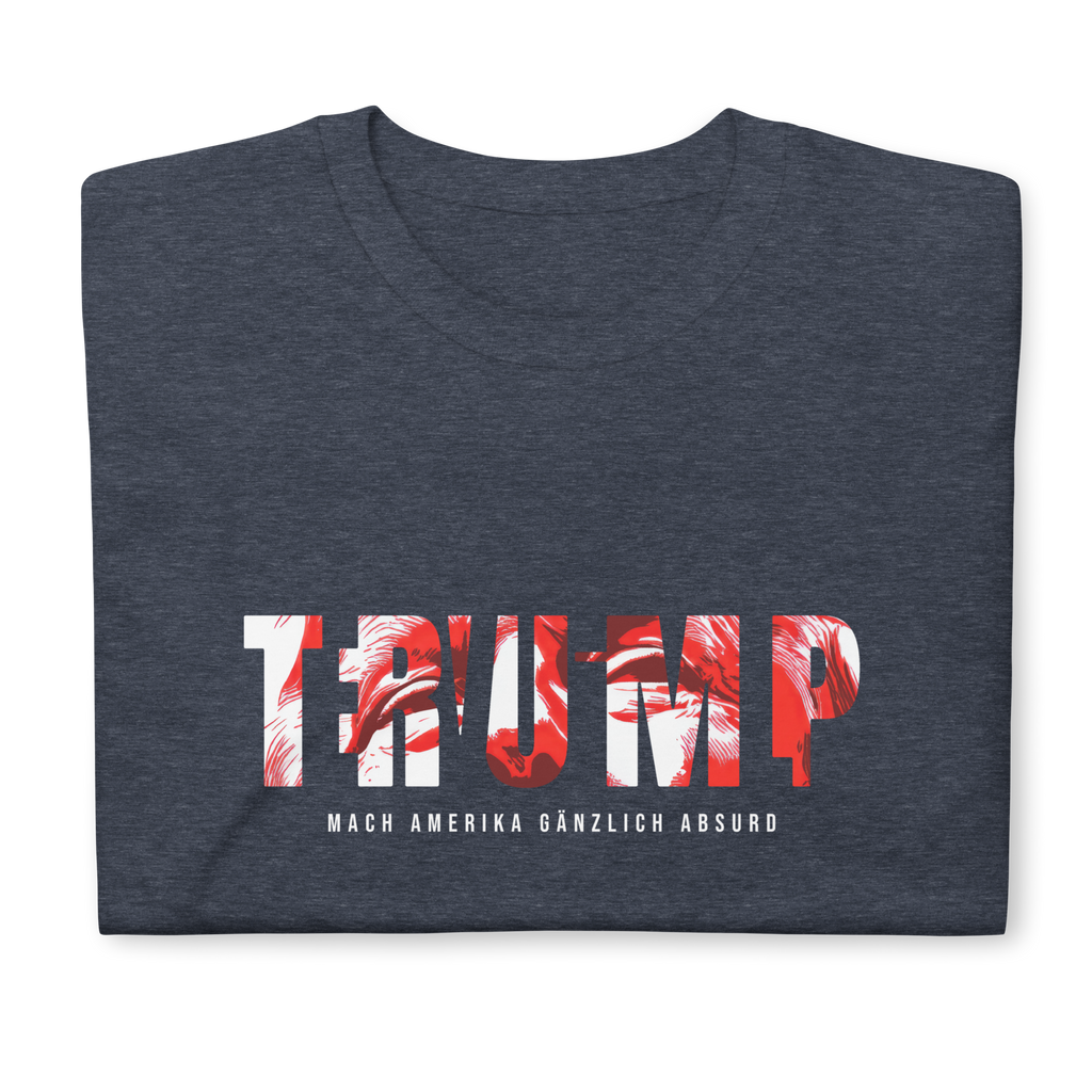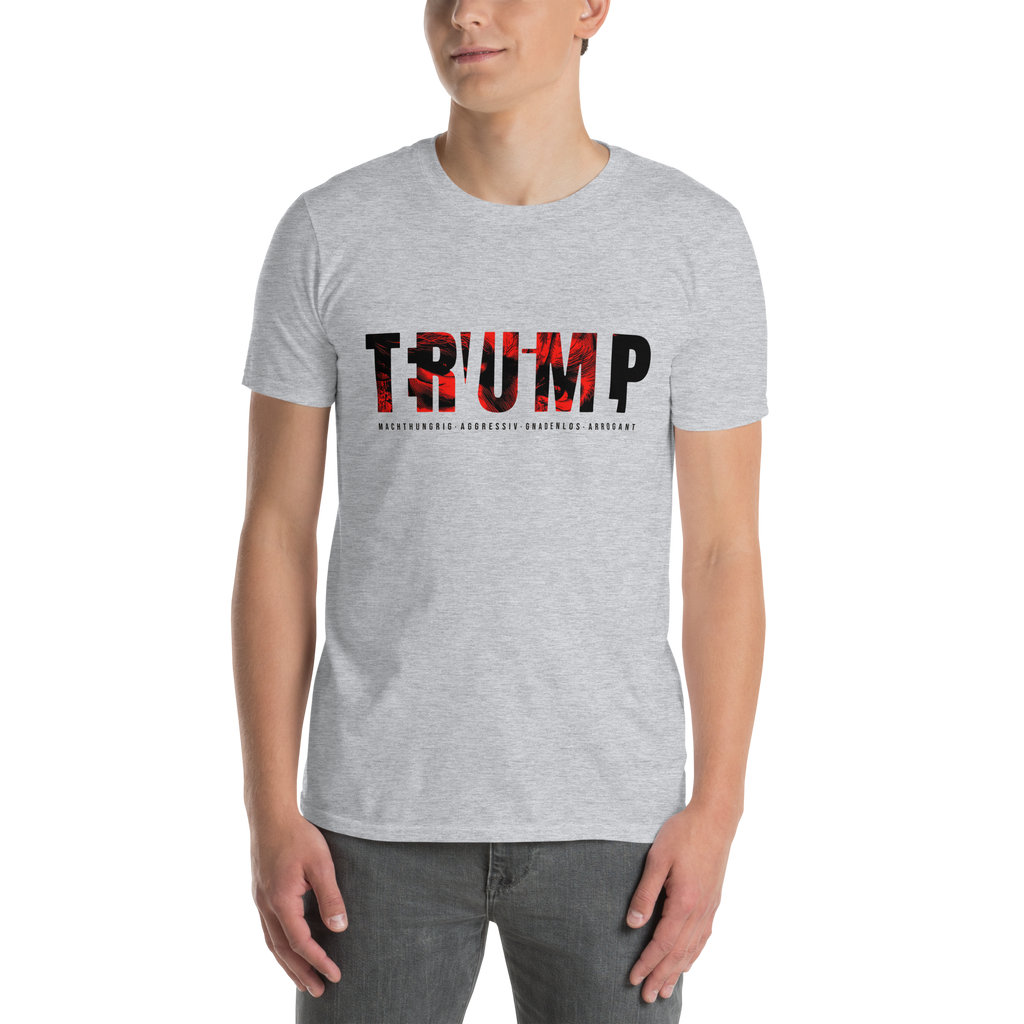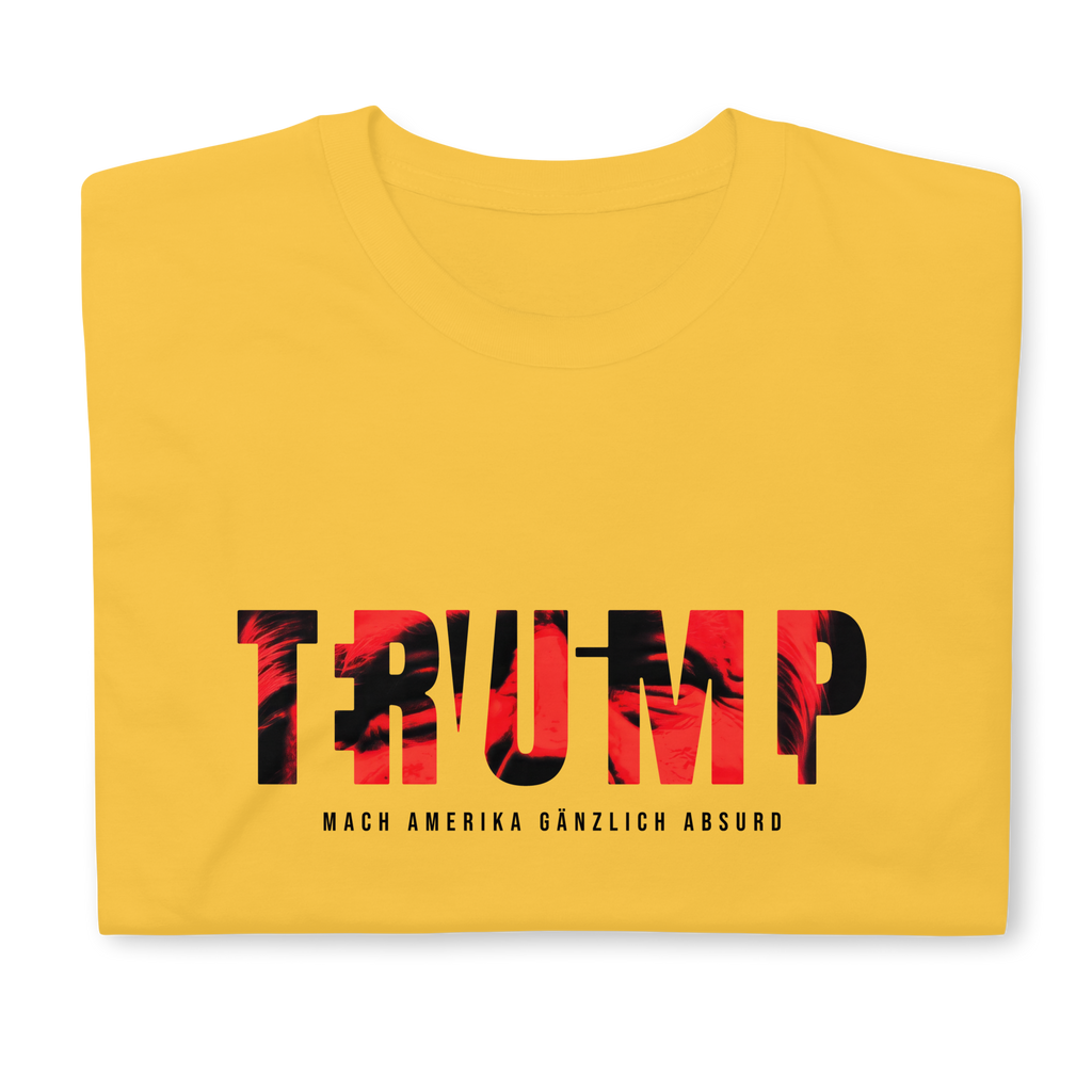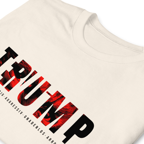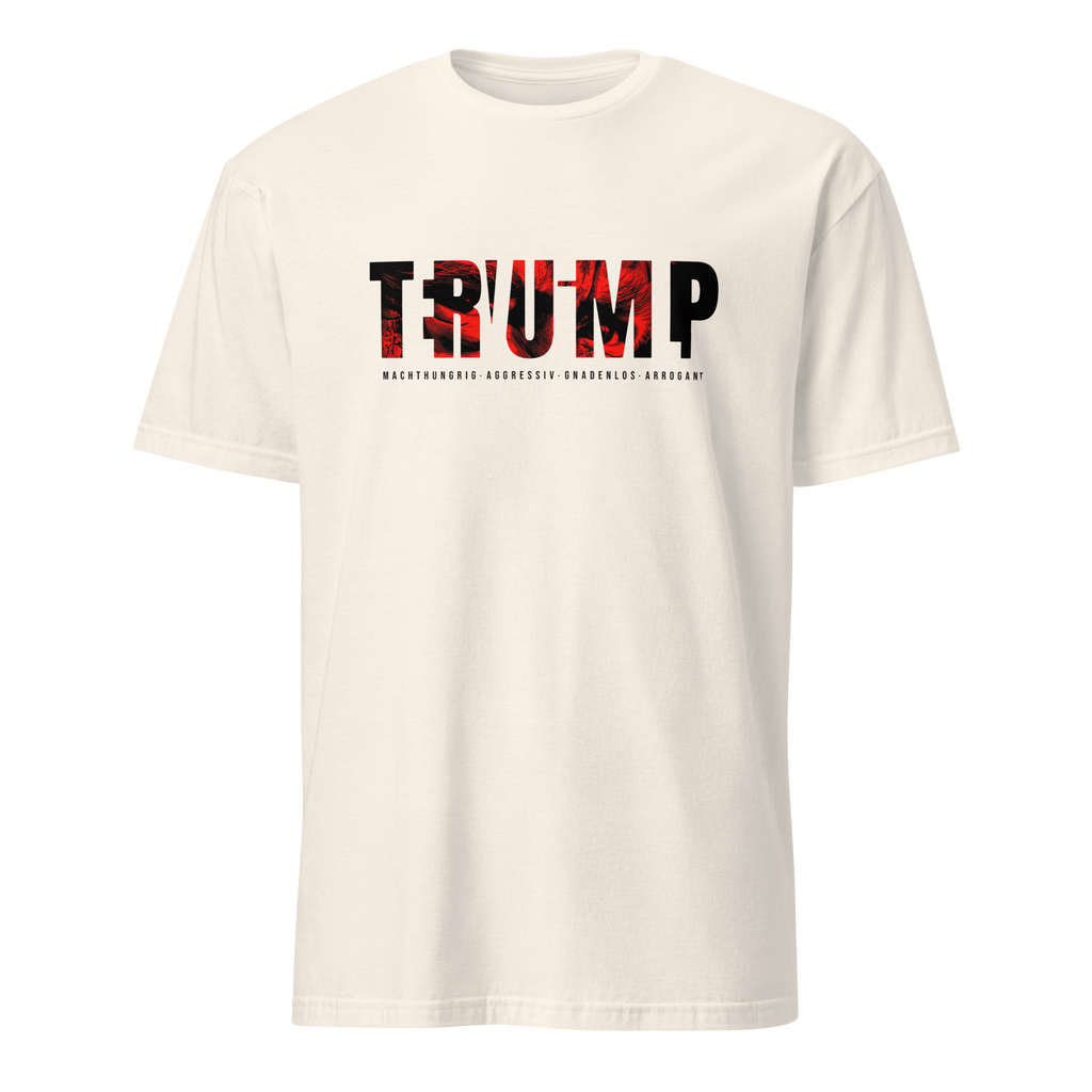 Auf den ersten Blick steht groß Trump auf der Brust. Wer genauer hinsieht, erkennt das versteckte Wort Evil. Ein typografischer Seitenhieb mit doppelter Bedeutung.