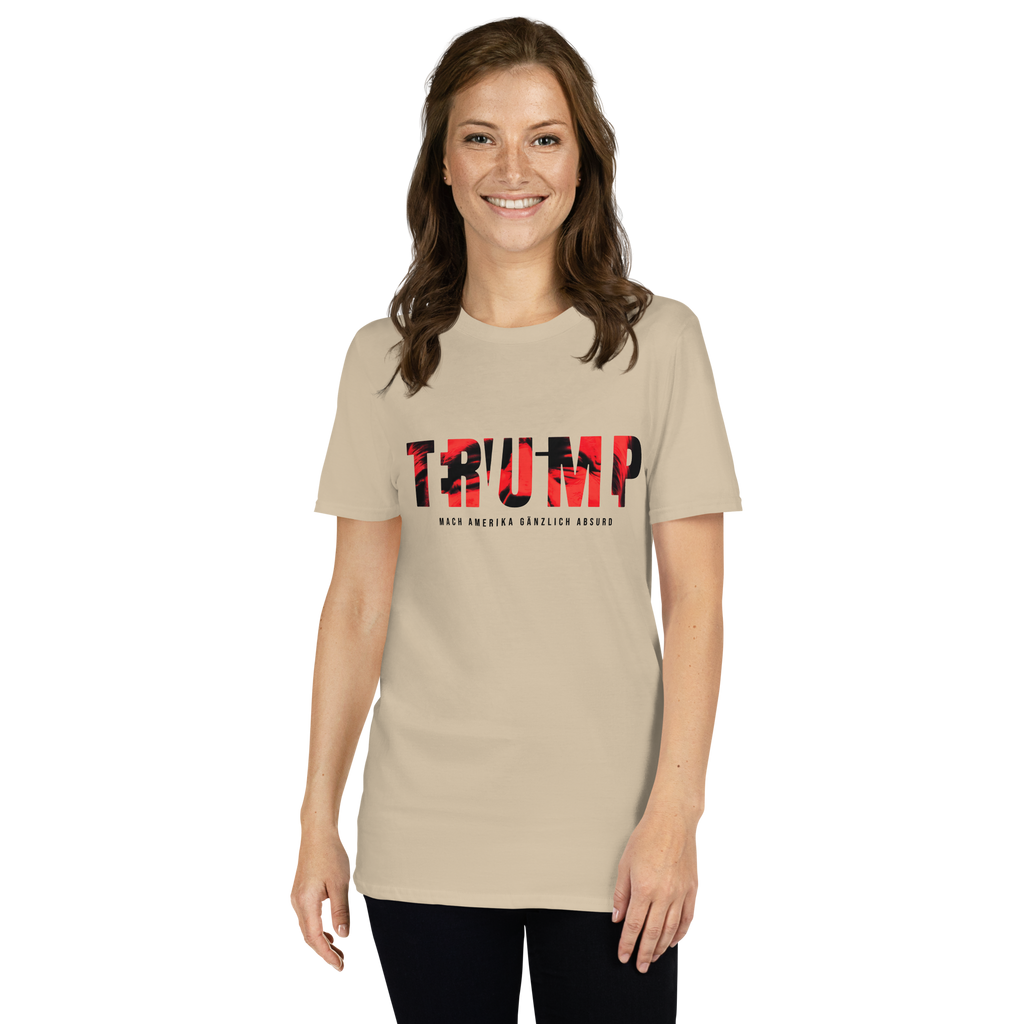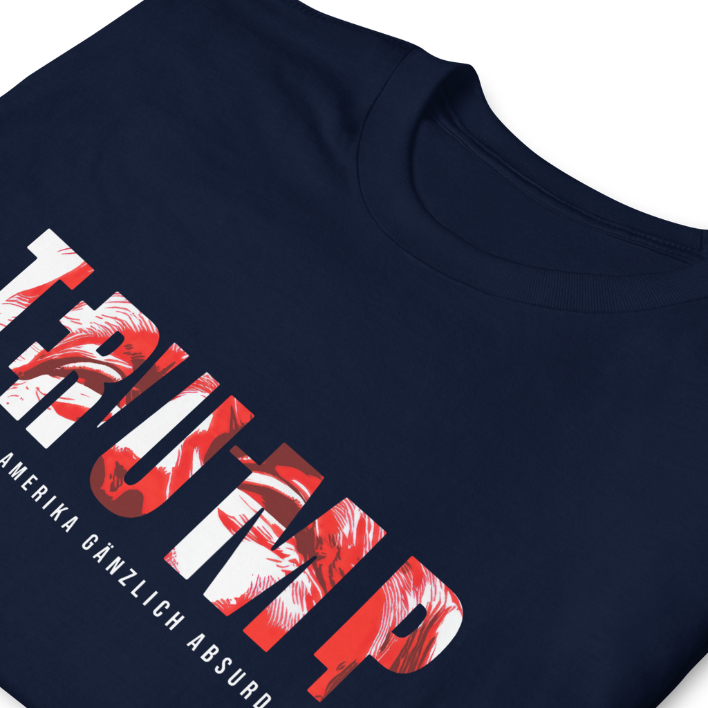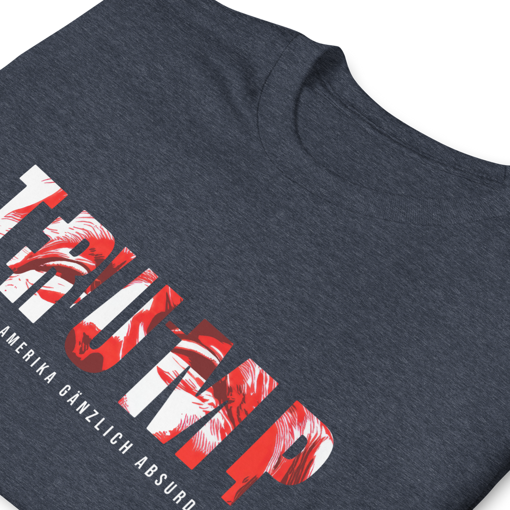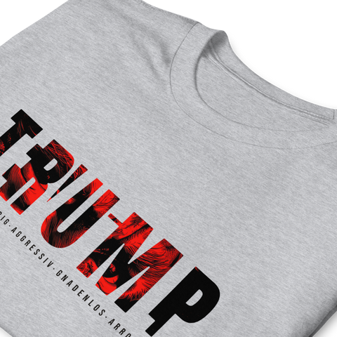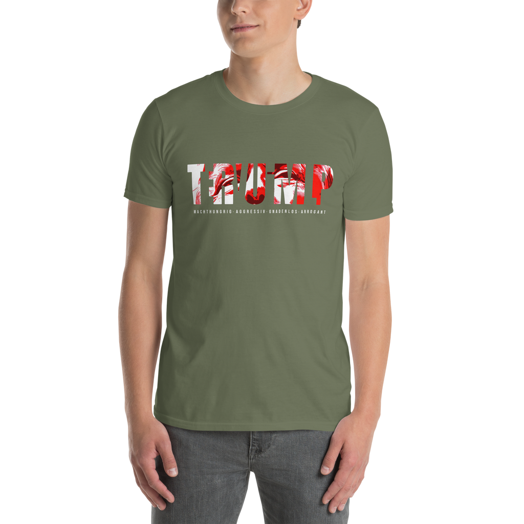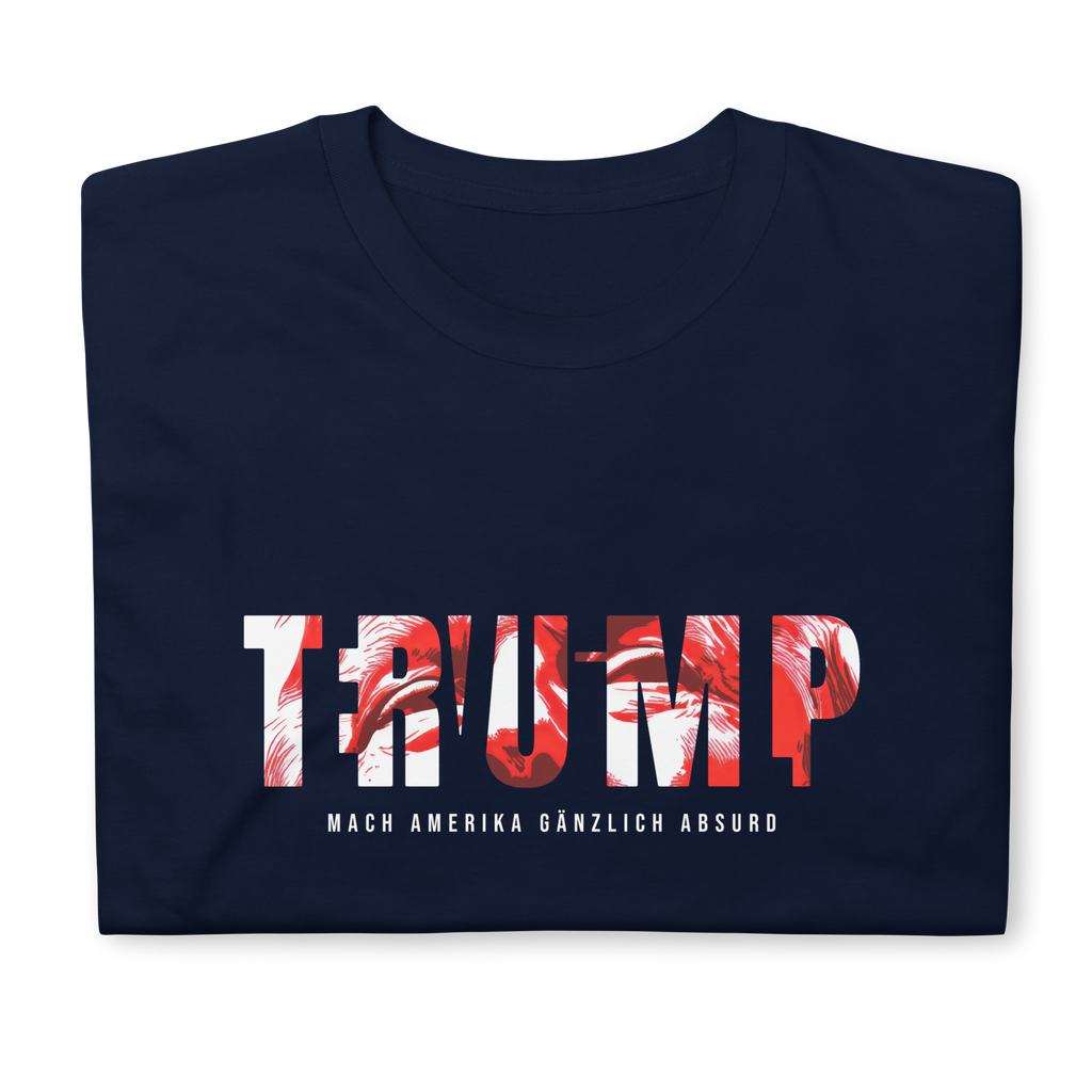 Auf den ersten Blick steht groß Trump auf der Brust. Wer genauer hinsieht, erkennt das versteckte Wort Evil. Ein typografischer Seitenhieb mit doppelter Bedeutung.