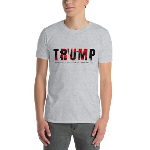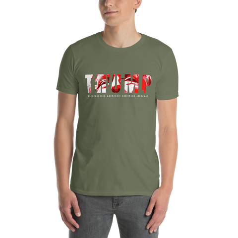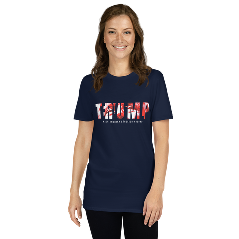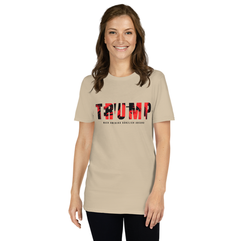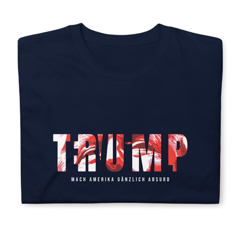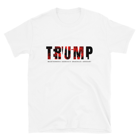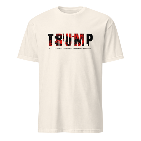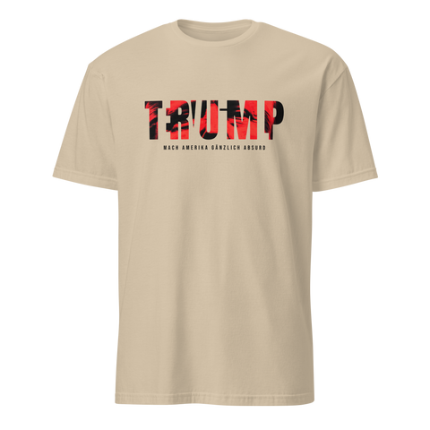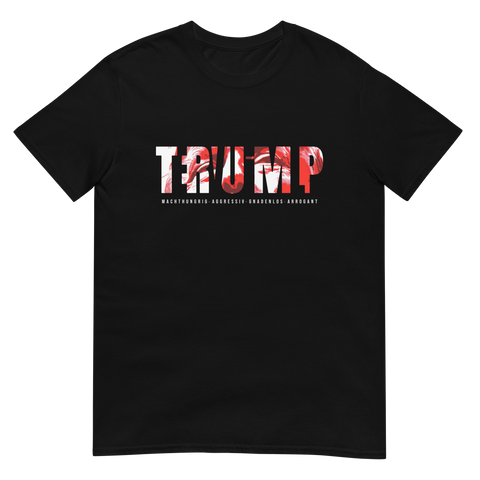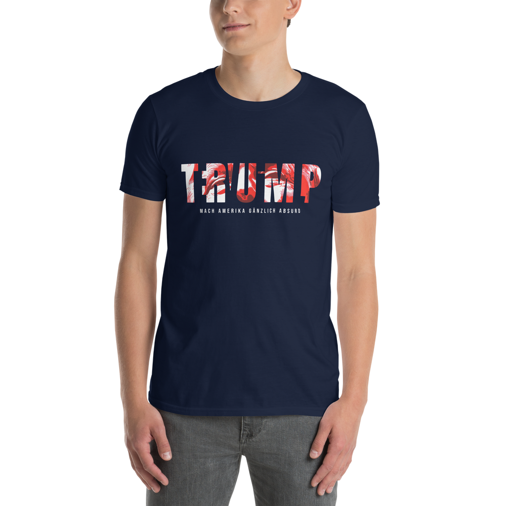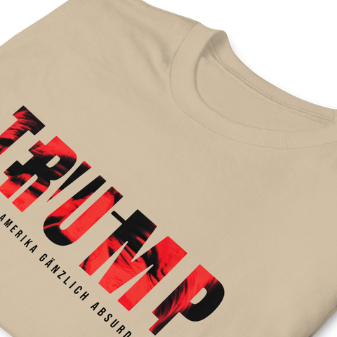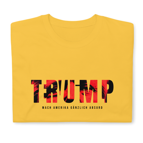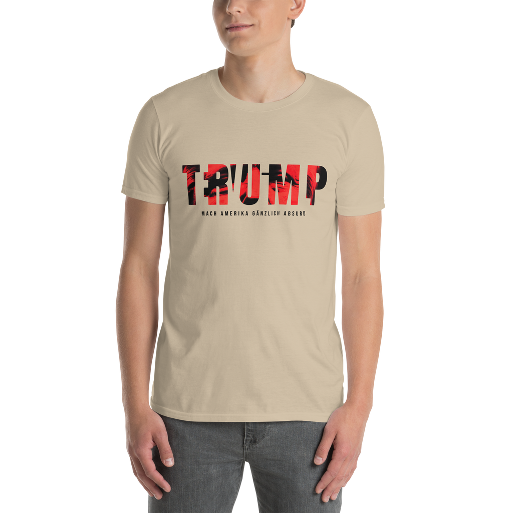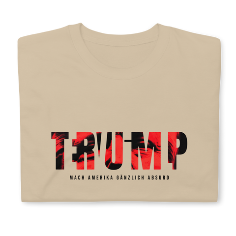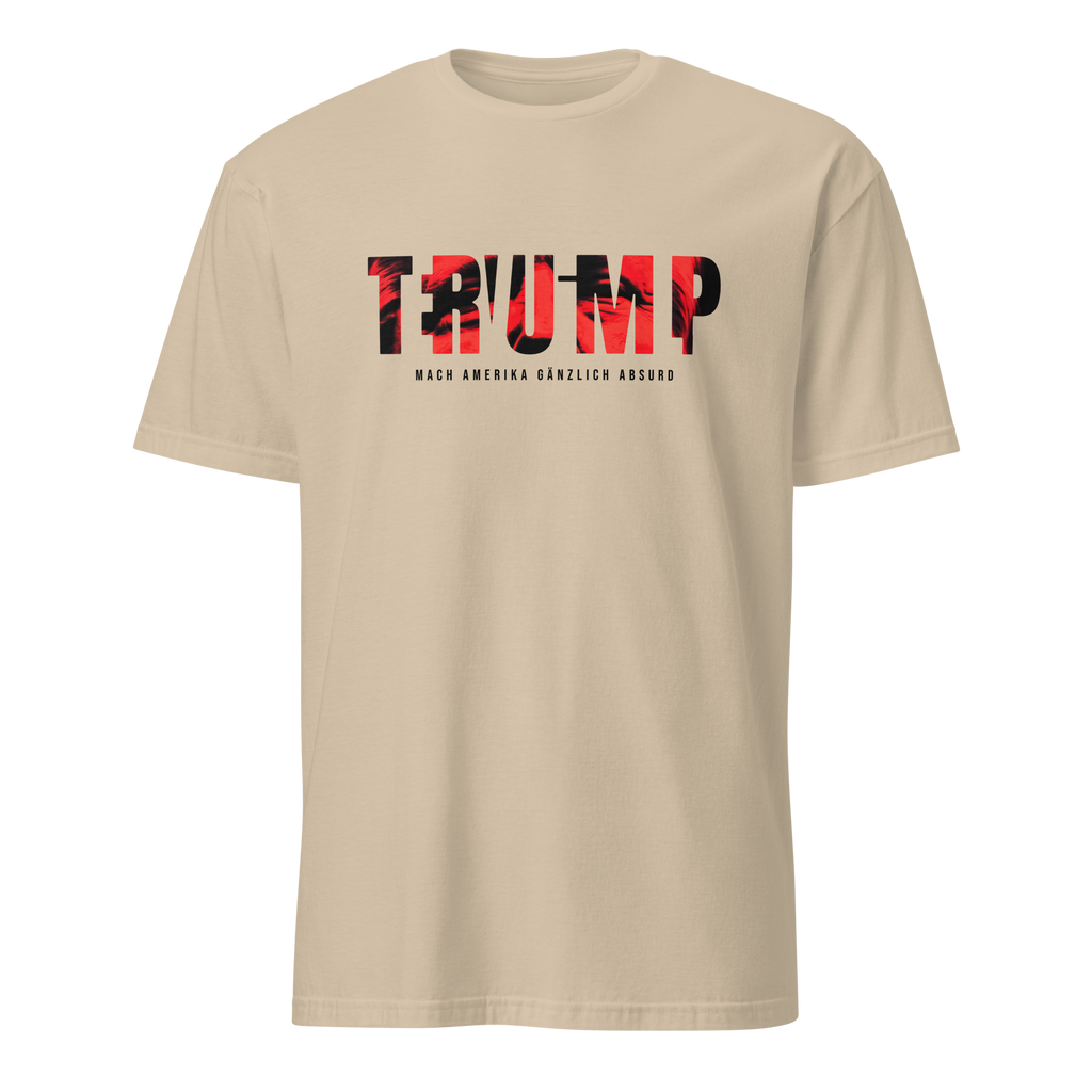 Auf den ersten Blick steht groß Trump auf der Brust. Wer genauer hinsieht, erkennt das versteckte Wort Evil. Ein typografischer Seitenhieb mit doppelter Bedeutung.