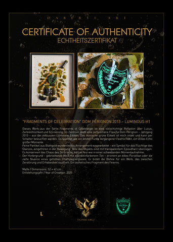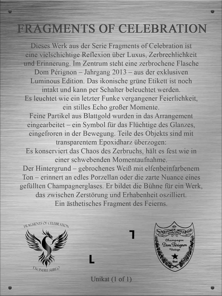 Dieses Werk aus der Serie Fragments of Celebration ist eine vielschichtige Reflexion über Luxus, Zerbrechlichkeit und Erinnerung. Im Zentrum steht eine zerbrochene Flasche Dom Pérignon – Jahrgang 2013 – aus der exklusiven Luminous Edition. Das ikonische grüne Etikett ist noch intakt und kann per Schalter beleuchtet werden. Es leuchtet wie ein letzter Funke vergangener Feierlichkeit, ein stilles Echo großer Momente.